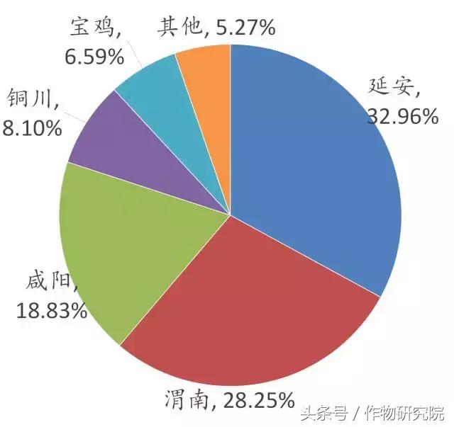中国果树研究所在《全国苹果区划研究报告》中,对我国各苹果主产区的生态条件进行了全面分析,指出陕西渭北旱塬是符合苹果生态适宜指标的最佳区域,尤以延安洛川县,宝鸡扶风县,咸阳市的永寿、乾县、旬邑、兴平、礼泉,以及渭南市的白水、合阳9个县为最佳,而这几个县苹果种植面积占了陕西全省的苹果种植面积的80%左右。陕西省苹果种植面积分布约为:延安种植350万亩、渭南300万亩、咸阳200万亩、铜川86万亩、宝鸡70万亩。